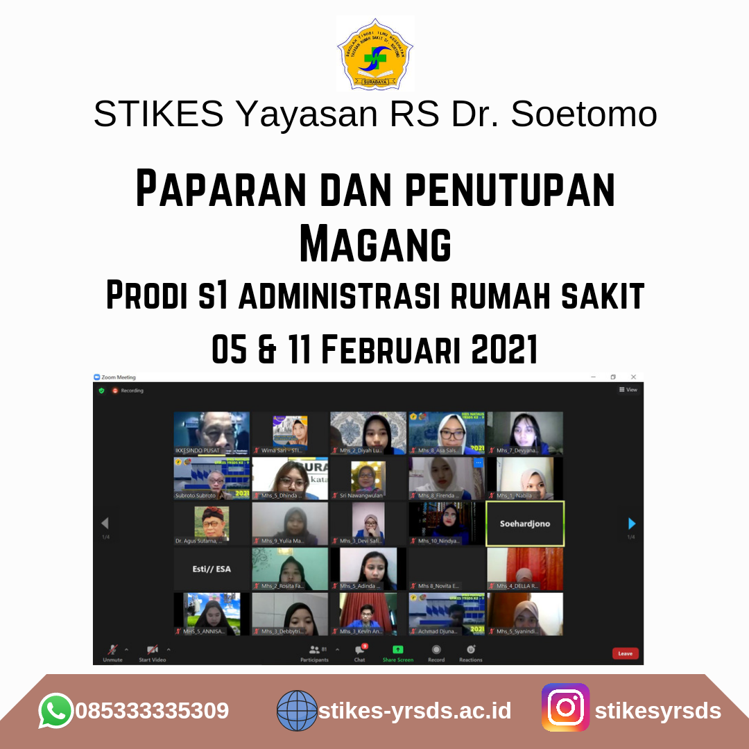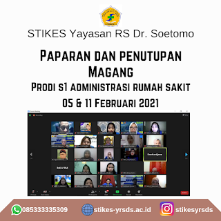 Kegiatan Magang Prodi S1 Administrasi selama 4 minggu diselesaikan dengan paparan laporan Magang pada tanggal 05 Februari 2021. 74 mahasiswa yang terbagi dalam 11 kelompok melakukan presentasi terkait pengelolaan indikator mutu rumah sakit. Paparan laporan hasil kegiatan Magang dilakukan di hadapan dosen pembimbing dan LDP Persi sebagai pihak penyelenggara.