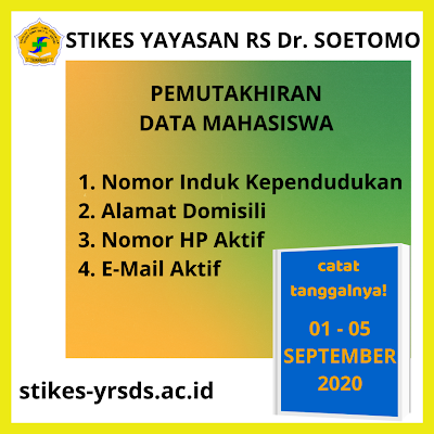 Kepada seluruh mahasiswa aktif STIKES Yayasan RS. Dr. Soetomo, diharapkan untuk mengisi pemutakhiran data pada tanggal 01 – 05 September 2020 melalui link di bawah ini :