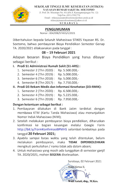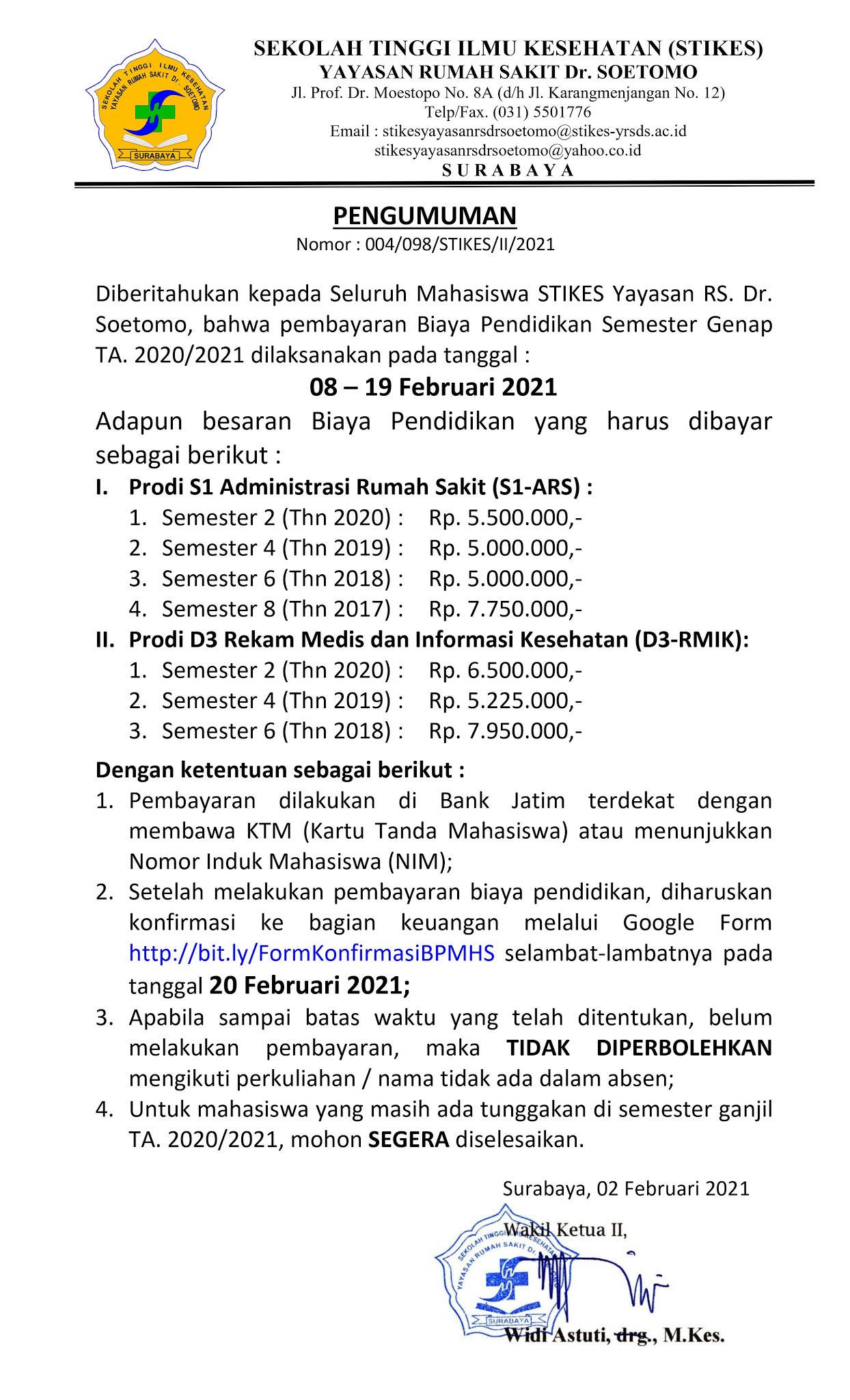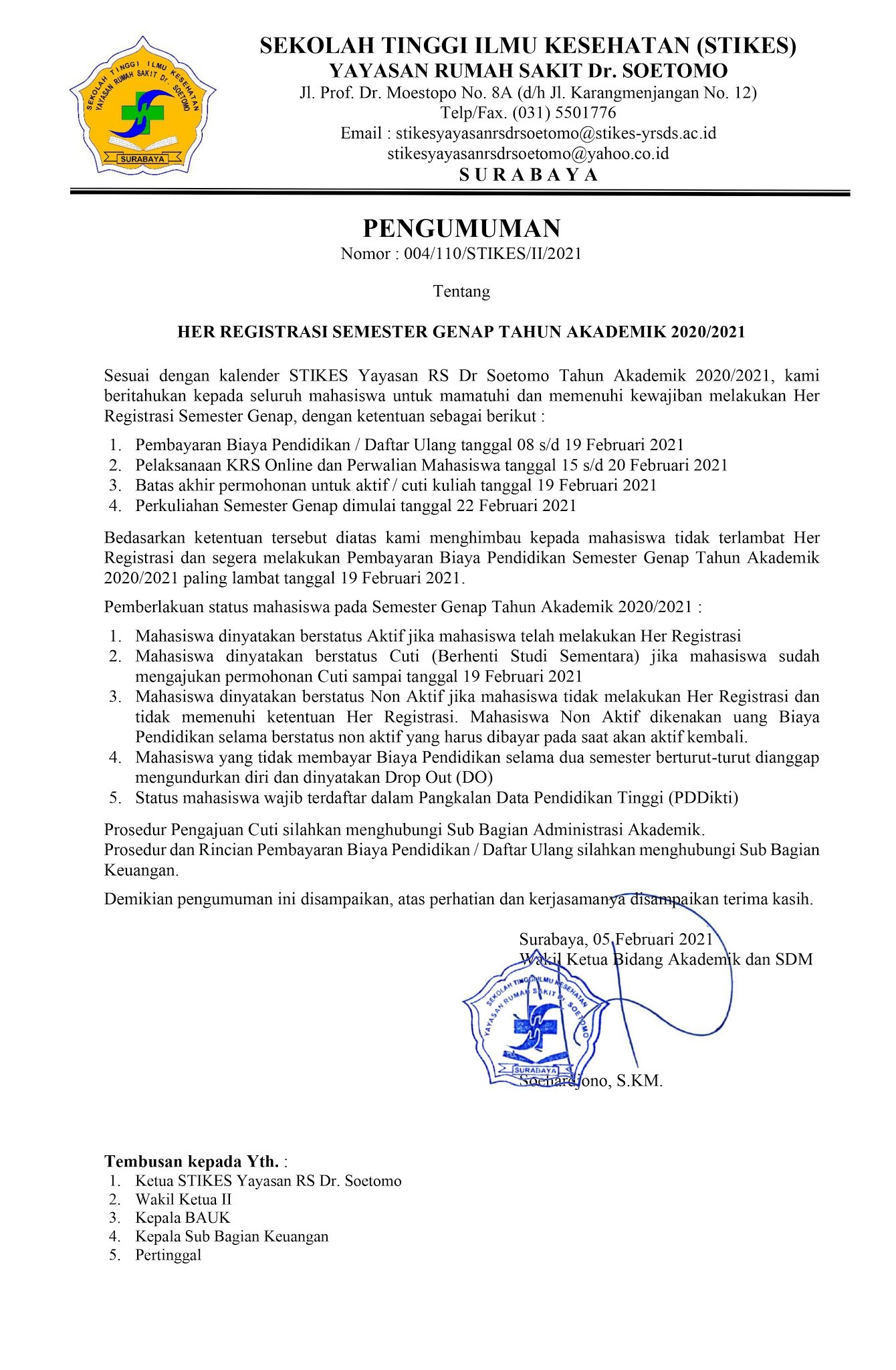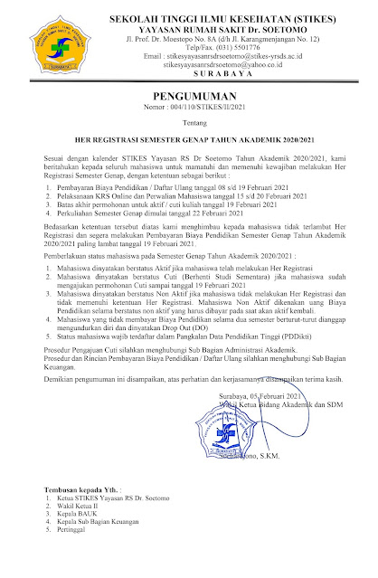 Sesuai Kalender Akademik STIKES Yayasan RS Dr. Soetomo Tahun Akademik 2020/2021, perkuliahan Semester Genap dimulai pada tanggal 22 Februari 2021. Sehubungan dengan hal tersebut, mahasiswa prodi D3 Rekam Medis dan Informasi kesehatan serta prodi S1 Administrasi Rumah Sakit dapat melakukan dafta ulang (her registrasi) pada tanggal 08 – 19 Februari 2021 dengan ketentuan seperti pada surat edaran di atas.