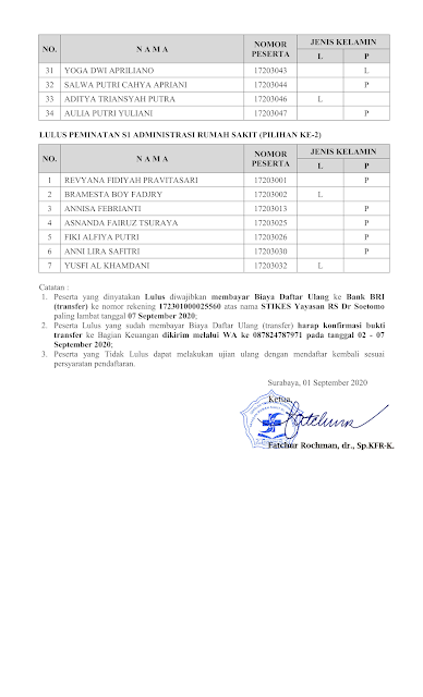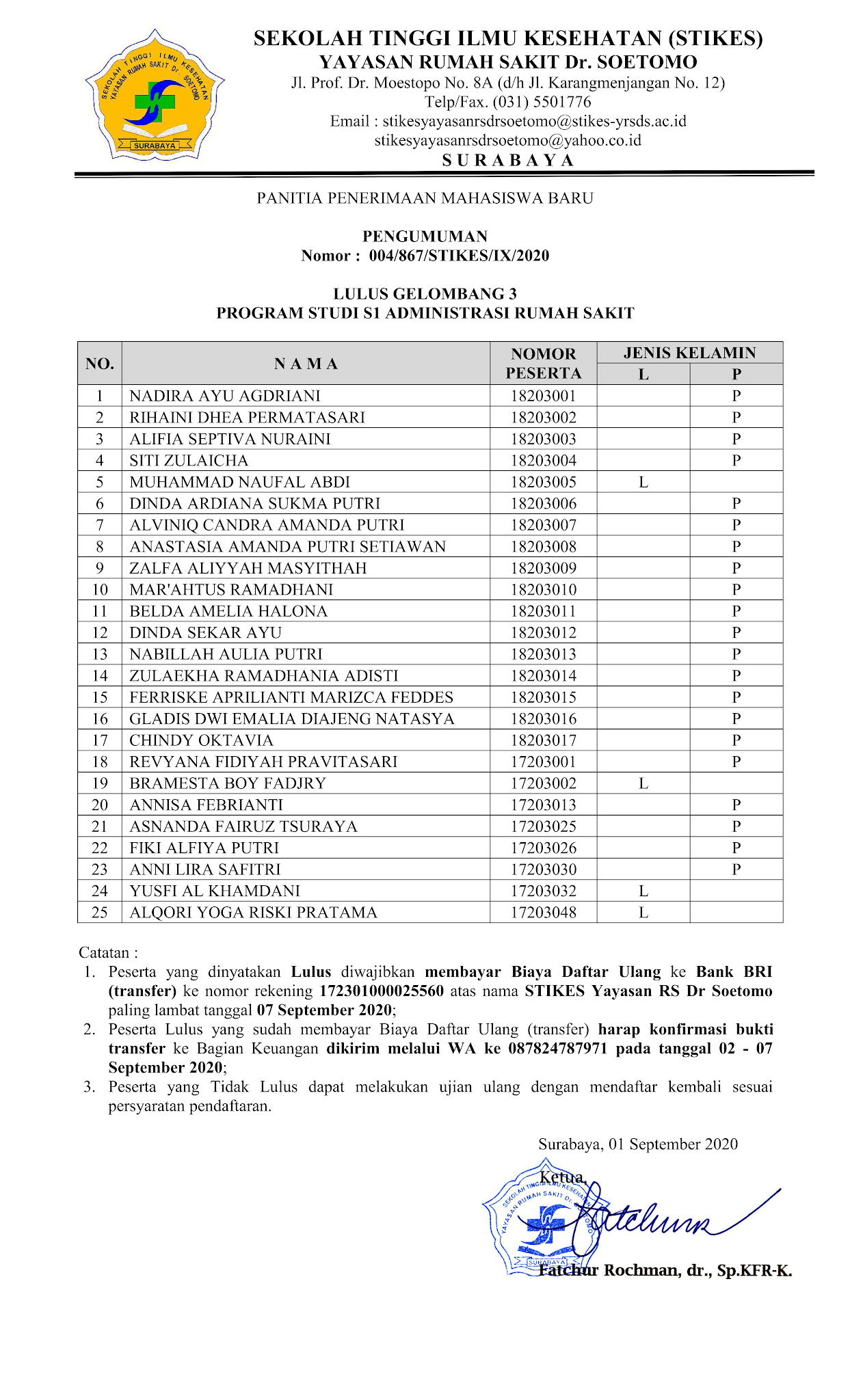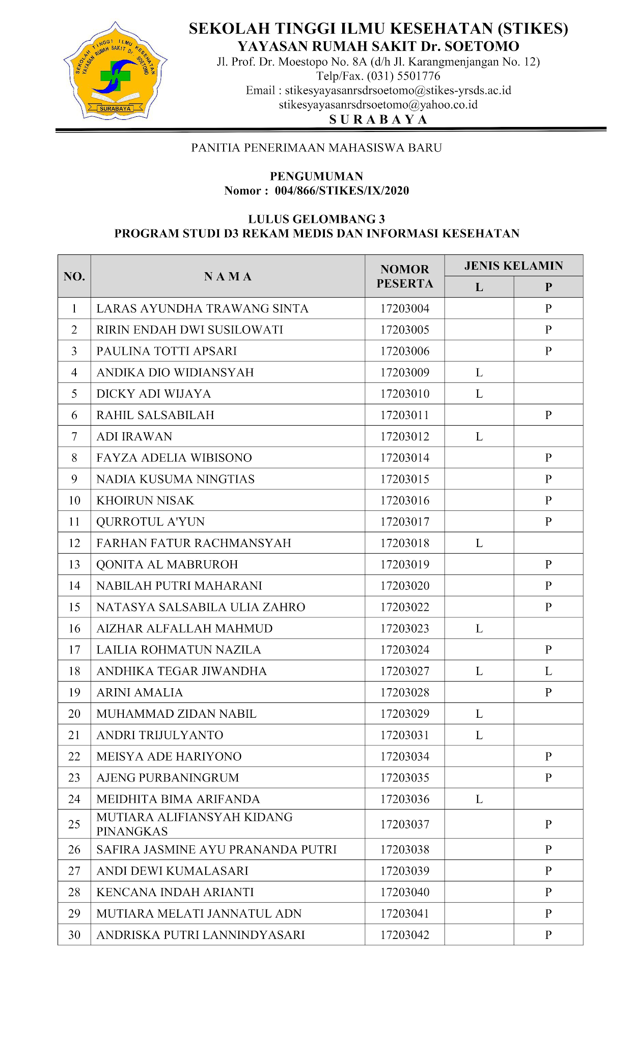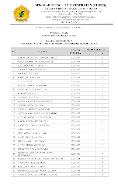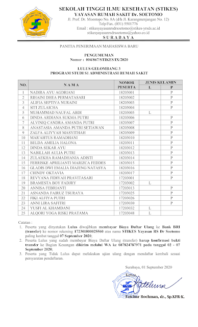 - Pengumuman Lulus Gelombang 3 Program Studi D3 Rekam Medik & S1 Administrasi Rumah Sakit