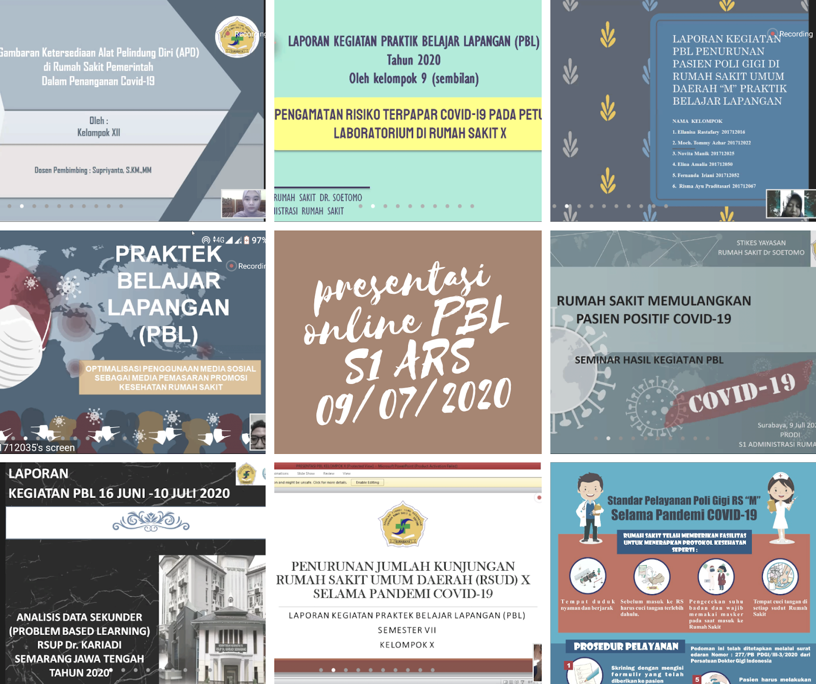 Kegiatan Praktek Belajar Lapangan (PBL) mahasiswa semester 6 Prodi S1 Administrasi Rumah Sakit yang dimulai tanggal 16 Juni 2020, berakhir dengan presentasi online melalui Zoom pada hari Kamis, 09 Juli 2020.